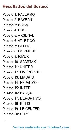 Lista de participantes: CITY, LIVERPOOL, BAYERN, DORMUND, LEICENTER, BOCA, SPARTAK, ESPANYOL, PSG, DEPORTIVO, ARSENAL, ATLÉTICO, RIVER, UNITED, CELTIC, BARÇA, PALERMO, ÍNTER, MADRID, BETIS, VALENCIA, CHELSEA.