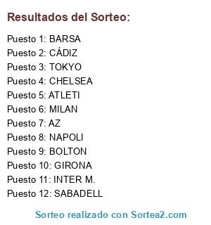 Lista de participantes: MILAN, CHELSEA, TOKYO, GIRONA, NAPOLI, ATLETI, INTER M., BOLTON, BARSA, CÁDIZ, AZ, SABADELL.