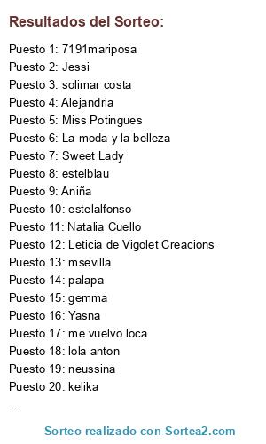 Lista de participantes: milagros gonzalez(2 participaciones), PILAR MENDEZ(3 participaciones), teresitaba(2 participaciones), kelika(3 participaciones), alice in wonderland(2 participaciones), Kellyta(2 participaciones), mce1991(3 participaciones), lola anton(2 participaciones), 7191mariposa(2 participaciones), Miss Potingues(3 participaciones), Carmen Trujillo(4 participaciones), Xandra(4 participaciones), Joanna Sz(4 participaciones), Ro Cío(3 participaciones), msevilla(2 participaciones), cris(2 participaciones), estelblau(2 participaciones), hueleacoco(3 participaciones), Alejandria(2 participaciones), naishi(2 participaciones), Natalia Cuello(3 participaciones), Aniña(3 participaciones), Isabel(3 participaciones), estelalfonso(3 participaciones), Fani(4 participaciones), Montse Prieto(2 participaciones), Sandra Girón Sasot(2 participaciones), Jessi(4 participaciones), Leticia de Vigolet Creacions(4 participaciones), maría moreira(2 participaciones), solimar costa(4 participaciones), Carmen González Gómez(2 participaciones), elgjca(2 participaciones), me vuelvo loca(3 participaciones), Sandra Ferré(2 participaciones), YENEVA(4 participaciones), La moda y la belleza(4 participaciones), palapa(3 participaciones), JARF8(3 participaciones), sissuka(3 participaciones), Laura(4 participaciones), yolybel1000(3 participaciones), Ana Breña(3 participaciones), Lafoir8(3 participaciones), gemma(3 participaciones), Anyolcocina(4 participaciones), Sweet Lady(3 participaciones), Anae(3 participaciones), Yasna(3 participaciones), Neus(2 participaciones), Babycosmetics(4 participaciones), neussina(3 participaciones), NuRya G.(2 participaciones).