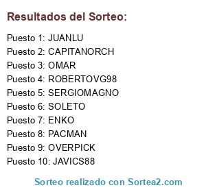 Lista de participantes: ROBERTOVG98, OMAR, OVERPICK, CAPITANORCH, SOLETO, JAVICS88, ENKO, SERGIOMAGNO, JUANLU, PACMAN.