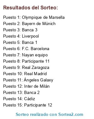 Lista de participantes: Ángeles Galaxy, Olympique de Marsella, Real Zaragoza, Bayern de Múnich, Cádiz, Real Madrid, Nayan equipo, Liverpool, F.C. Barcelona, Inter de Milán, Participante 11, Participante 12, Banca 1, Banca 2, Banca 3.