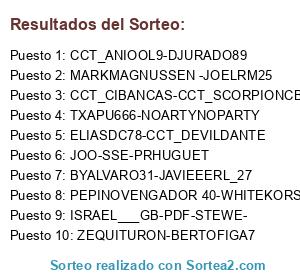 Lista de participantes: JOO-SSE-PRHUGUET, ZEQUITURON-BERTOFIGA7, PEPINOVENGADOR 40-WHITEKORSA, MARKMAGNUSSEN -JOELRM25, CCT_ANIOOL9-DJURADO89, ELIASDC78-CCT_DEVILDANTE, TXAPU666-NOARTYNOPARTY, ISRAEL___GB-PDF-STEWE-, CCT_CIBANCAS-CCT_SCORPIONCBR, BYALVARO31-JAVIEEERL_27.