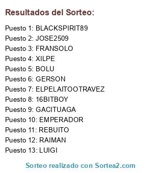 Lista de participantes: JOSE2509, XILPE, BLACKSPIRIT89, ELPELAITOOTRAVEZ, GERSON, BOLU, GACITUAGA, EMPERADOR, REBUITO, LUIGI, RAIMAN, 16BITBOY, FRANSOLO.