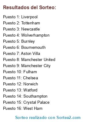 Lista de participantes: West Ham, Manchester City, Chelsea, Tottenham, Manchester United, Wolverhampton, Liverpool, Crystal Palace, Burnley, Fulham, Southampton, Newcastle, Watford, Norwich, Bournemouth, Aston Villa.