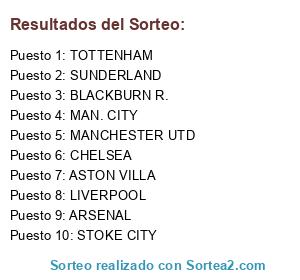 Lista de participantes: BLACKBURN R., SUNDERLAND, MANCHESTER UTD, MAN. CITY, ARSENAL, ASTON VILLA, STOKE CITY, LIVERPOOL, CHELSEA, TOTTENHAM.