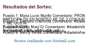- Ganador: Maria Lucio Murillo Comentario: PROMOCIONES DIA DEL NIÑO PARTICIPA EN EN SORTEO DE DE 3 CONJUNTOS EN VIVO. 1. ME GUSTA 2. COMPARTE 3. COMENTA #diadelniñoenbabykids