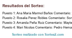- Suplente 1: Rosalia Perez Robles Comentario: Sorteo genial..participo!!comparto la suerte con Sonia Guirao Sanchez, Fina Pomares Juan,Sonia Soriano,Cristina Cases Ortuño.