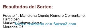 - Ganador: Marielena Quinto Romero Comentario: Esta super linda. Con fe 🌷😁🎁 Participen Marleny Salazar Nores Morenita Qf Cecilia De La Cruz Suerte 🎁😍🎁😍🎁😍🎁