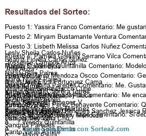 - Ganador 3: Lisbeth Melissa Carlos Nuñez Comentario: participen Lesly Sheila Carlos Nuñes Beatriz Fiorela Carlos Nuñez Magaly Dayan Blas Nataly Blas Palma Maria Nuñez Palma Rosa Bernal Keyla Ormeño Mica Isabel Castillo seria la de unicornio