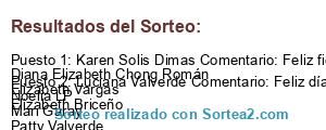 - Ganador: Karen Solis Dimas Comentario: Feliz fiesta patrias a todos los peruanos que celebren como patriotas que somos con su rica comida y música de nuestro costa Sierra y selva Espero tener suerte en este hermoso sorteo❤️❤️❤️ muchos exitos a la página chicas participen darle like a la página confiable Diana Elizabeth Chong Román Elizabeth Vargas Elizabeth Briceño