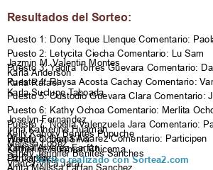 - Ganador: Mary Ruggel Flores Comentario: Participen chicas ojala gane Maria Esteffany Bardales Saavedra Tiara Alvines Iris RF Rita Cabanillas Saavedra