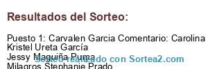 - Ganador: Carvalen Garcia Comentario: Carolina P Ramírez Kristel Ureta García Jessy Maguiña Puma Milagros Stephanie Prado Estefani Palmadera Zuñiga Participen