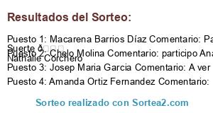 - Ganador: Macarena Barrios Díaz Comentario: Para vosotros si me toco Francisco Manuel Díaz y Juan Suerte 🍀 Nathalie Corchero