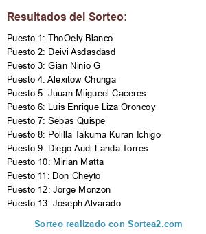 Lista de participantes: ThoOely Blanco, Manu Paredes, Chia Boo, Lía Esquerre Casta Ñeda, Jose David Vargas Vargas, Mayte Sanchez Caso, Yonel Daniel Figuerola Vasquez, Mac Carbajal, Maati Cabj, Astrid Deborath, Ignacio Palacios Partida, Moises Robles Lopez, Luis Miguel Talledo Yahuana, Yefferson Rafael Castillo Peña, Guadalupe Fernandez Flores, Angel Montes, Faber Stiwar Perez Sanchez, Antony Perez Holguin, Helen Fiorela Cutipa Chana, Jorge Monzon, Randold Millan, Diego Guatibonza, Belèn Patita, Iarii Aversano, Troxs AxesoPlus, Kleii Gutierrez, Pablo Matos, Nelson Ventura, Don Cheyto, Jose Manuel Carpintero, Manuel Martin Ventocilla, Stephany Lokita Miraval Fas, Aleex Love, JhoNny JG Chacon, Rýa Haru, Lily Xz, Angel Alcalá, Cristobal Gomez, Bridget Lu, Brian Castro, Daniela Falconi Alzamora, Brenda Estefany Gutieerez Muñoz, Nicolas Marcos Dionicio Palacios, PrincesiiTa CoqeTa Qariina, Gazeozita'Sponja D' Bob, Gustavo Amaro Tarazona, Giovanita Giovanita Rengifo Salas, Andrea Enoki Prado, Yosimar Rios, Dayanitha Fatticcioni Cancho, Jherson Farid Reyes Arcos, Fernando Valdivia Diaz, Arturo Luarte, Henry' Nígth, Kotaro Misan, Zeltzin Cueva Lopez, Estela Ohiggins, Fabrizio Antay Alarcon, Narda Pedraza, Isabel Luyo Narsiso, Juan Carlos Flores Mamani, Alexa Irina Vargas Pino, Antonio Garcia Rodriguez, Klaudiixiithap Maz NailOn Tkm, Lya Mirella Meliizah, Frezzi Camborda, Boowsmiitha Afk, RoshiTap Alokada Huaman, Luiz Angel Gomez, Mirian Matta, Milagros Coziitaw Screammemaw, Ana Paula Roca Carrión, NoneeZhito Kozhiitoo Arias, Leandro Araujo Arellano, Gaab Morales, Lau Rondón A, Jean Piere da Cruz, Santiago Villamil, Guille Estrada, Daniel Zapata Romero, GiiOk A Gtz, Mariell BandiiDa Koqetonah, Steven Genin Escobar, Gabriel Gonzalez, Juan Martin Juarez, Kurt Attack, Edward Suca N, Choko Garcia, Naxo Galarce, Angel KroNos Vargas, David Eche, Anthony Gonzales, Helmvt Gatitow Qvispe Chvrata, Alison Chávez, LeoneLa AviLes, Katty Delgado, Frank Jose Navas, Juan Camacho, Qamila Rm, Carlos Ticse, Sónia Dias, JamiiZitah Ryz Aqno, Luis Vidal, Mariia Cajusol, Lyharu Akatzuki, Lezs Morante Saman, Rin Kagamine 1, Denîîz Nuñez, Charly Richard, Sharon Garay, Dania Arias Muñoz, Daniel Esteban Fernandez, Manuel Cupe Missa, Chatpong Pongsupamongkon, Luizhito Ramos Torres, Erizikâ Taipe, Estefani Espiritu, Angello Román Arias, Arasely Ramos, I'Seergiioow D'Brown, Brayan Bartolo, Luishitho Dx, Kai Kagamine, Joel Gonzales, Jhon Torres Ramos, Ricardo Cadena Oliveros, Elizabeth Morales, Fabian Andres Gonzales Narvaez, Paul Dennis Vilchez Julca, Yordan Sullca Palomino, TheYoao Mas Na, Andres Llanquilef, Luis Dolandes, Neyra AlonzOo, Jossi Esteban Gonzalez Hernandez, ËmîTö Jhanz Hermoza Alvarado, Alexandra Rosa Romero Ramirez, Markiithop Lopez Paucar, Kayzer Erick Cardenas Gonzales, Ariana Cervantes Bermejo, Haruhi Chan Suzumiya, Leyla Mamani, Brenda Rojas, Sthefanny Morales, Kevinn Llanos C'h, XKevinzhitox Lokito, Yelsin Poma, Man Rasta, Joseph Romero, Julio Taipe Arteaga, Gianella Roxana Valer Ventura, Gustavo Hdz Rdz, Sandy Alexandra Hernandez, Luishx Alonxhito Copete, Franqqo Vegga, Invisble Bsk Mujer Transparent, Italo Gonzalo Pilco Casani, Fast CeTus, Bryan AxesoCrew, YaYo XD, Cristian Bien Cabron, Mairold Palma, Nenito Ni, Hugo Alberto Mestra Agudelo, Min Hyo-Rin, Lèeézs VeelàzsQkz, Nelly Johana, Alfredo Alvarado Dolores, Esteban Vilca, Percy Luque, Jairo Andres Orozco Zapata, VorØs BF Crew, Gianmarco Pw Santizteban, Viinz Fiin, MaTiaz Patricio Romero Valdebenito, Lucerito Sanchez Yanayaco, Myckiiw De Lp, Johana Ch, Abigail Barestegui Enamisa, Bryanzhito Weill, Gari Yair, Qeliih A Gtz, Danny Alborotado, Jairo Péw, Eztrelliita Rodriiguez, Diego Audi Landa Torres, Ckarlitoz Cuenca, Greta Salinas Aragon, Zin Conciencia, Mashii Del Audii, Paau Vultury, Toshiro Liu Schiffer, Leidy Ayca E, Christiam Barboza Ortiz, Debbie Sandoval, Gerardo Prado, Giancarlo Muñoz Paredes, Xiomara Tovar Malasquez, Sandrita Lau, Angee Maztii, Diego Alejos, Pao Candia, Jano Mathiias, Màrieel' Aròztegui Rozaz, Dianiita Nataly Lc, Pao Arias, EduarCito Aylas, Evy Cama, Wendoly Pariona Gwen Audi, Valeriiah Mv, Miguel Angel Tineo, Jhampierzitow Na Mas, Juan Pablo Restrepo Aldana, Sebas Poveda Rojas, Maribel Roxana My, Carol Meza Ticona, Lucy Cyank Momz, Diego Palomino, Cinthia Guzman, Jozze Jams Ikatsuki Son, Jhónny' Audi Tórrés Cvlqvi, Gian Ninio G, Niqiito Lenechmidt, Junior Christopher Neyra Vela, André Santiago, Angeliito Xikito Lindo, Giovanny Vilchez, Alber Mamani Portugal, Eduard Bravo Valdiviezo, Morrigan Aensland, Joo ßëßïtö, 'Lax Ziitah Molina, Gabi Rdz, Luiisiio Retana, Jose Eduardo Saavedra Soto, BobhIta Ivy Burbrbr, ChriisTiian SeiivaNe, Diego Rock, Mario Ernesto Up, Gino Bucciarelli, 'Michel Kozinga, Tuh CarameLithow, Pato Jp Duck, Daniel Caceres, Anita Kpop, Missaki Jin Sandoval, No Se Tampoco, Zeito Kazuki Asdasd, Karina Caceres Altamirano, Cris Arce, Milapo Fernando Contreras Reyes, Cesar Bigpoint, Toño Jiménez, Polilla Takuma Kuran Ichigo, Zack Bermudez, Antonio Cruz Vara, Luigitozh AR, Francis Medina, Milagros Bouroncle Grundy 1, Cesar Tumba Tasayco, Simplemente Chola En Argentina, Pàoline Le Clairt, YoLiis Ho, Stiven Faustino, David Robles, Cesar Ortiz, Dan Qiao, Leslie Rojas, Carlos Campos Huaman, Jeiisson Ramiirez, Emil Barrera, Pablito Pomies, Jose Enrique, Markhito Saravia, Bryan Neil Espedilla Ayqui, Luzhito Xz Wz, Gerson Dagnino, Valeria Lucía Meza Olivos, Mario Salazar Fuentes, Jaime David Burbano Montoya, Jesus Quiñones Caceres, Jhimy Jara, Natalia Rodriguez Herrera, 'Rícárdó Sébástíán, Organizador Almaoscur, Mar Khi To Saravia, PöcöYönii Kuran Mäz Näh, Cristian Barreto, Jorge Oswaldo Martinez, Kêvîn Huarcaya, Lizet Bautista, Yabita Scout, JoseRamirow SK Galindoo Alvaradoo, Firyal Dhaifan Putra, DemozitOw Hard, Alexitow Chunga, Julio Mendoza, Rin Kagamine, Kyö Kuzanagí, Pökemönä Raww, Espinoza Obregon Kenedy, Jose Alberto Ferrer Martinez, Argenis Castillo, Di