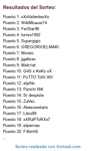 Lista de participantes: Sr despiste, xXRaPToRXx7, ADRIBLANCOO, jorchebopa, FerStar96, xXxValientexXx, Abeeceedario, CarlosBD9, torres1992, GREGORIOELMAKI, ZaVeL, alpiNo, Cograt95, Moreio, xTritu CRAZY, Panchi l94l, G4S x KeKo xX, elpiernas, Malcriat, jjgalloso, Bachi, AdriLozano, Supergigio, WikiMbauer74, PuTTO ToNi XIII, Litos89, F4binh0.