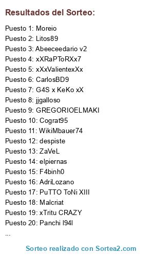 Lista de participantes: despiste, xXRaPToRXx7, ADRIBLANCOO, jorchebopa, FerStar96, xXxValientexXx, Abeeceedario v2, CarlosBD9, torres1992, GREGORIOELMAKI, ZaVeL, alpiNo, Cograt95, Moreio, xTritu CRAZY, Panchi l94l, G4S x KeKo xX, elpiernas, Malcriat, jjgalloso, Bachi, AdriLozano, Supergigio, WikiMbauer74, PuTTO ToNi XIII, Litos89, F4binh0.