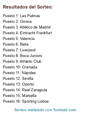 Lista de participantes: Athletic Club, Las Palmas, Sevilla, Nápoles, Sporting Lisboa, Granada, Eintracht Frankfurt, Boca Juniors, Atlético de Madrid, Liverpool, Girona, Real Zaragoza, Oporto, Marsella, Betis, Valencia.