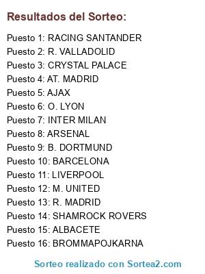 Lista de participantes: M. UNITED, R. VALLADOLID, RACING SANTANDER, INTER MILAN, R. MADRID, O. LYON, ALBACETE, SHAMROCK ROVERS, BROMMAPOJKARNA, BARCELONA, AT. MADRID, ARSENAL, CRYSTAL PALACE, AJAX, B. DORTMUND, LIVERPOOL.