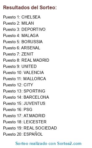 Lista de participantes: CHELSEA, UNITED, AT.MADRID, REAL MADRID, ESPAÑOL, PSG, VALENCIA, CITY, ARSENAL, DEPORTIVO, BORUSSIA, MILAN, BARCELONA, REAL SOCIEDAD, LEICESTER, SPORTING, MALAGA, MALLORCA, ZENIT, JUVENTUS.