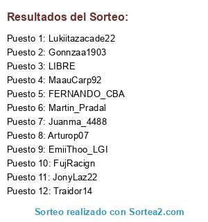 Lista de participantes: Juanma_4488, Lukiitazacade22, Gonnzaa1903, FujRacign, Traidor14, Arturop07, MaauCarp92, Martin_Pradal, FERNANDO_CBA, EmiiThoo_LGI, JonyLaz22, LIBRE.