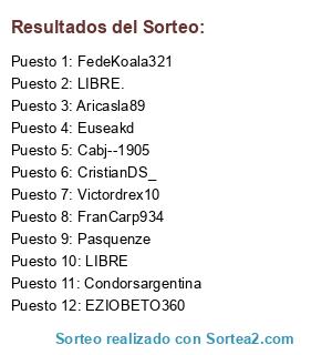 Lista de participantes: Condorsargentina, FranCarp934, CristianDS_, Aricasla89, LIBRE, Victordrex10, FedeKoala321, Euseakd, Cabj--1905, EZIOBETO360, Pasquenze, LIBRE..