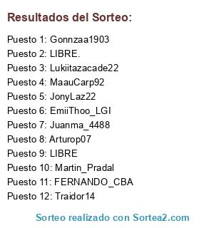 Lista de participantes: Juanma_4488, Lukiitazacade22, Gonnzaa1903, LIBRE, Traidor14, Arturop07, MaauCarp92, Martin_Pradal, FERNANDO_CBA, EmiiThoo_LGI, JonyLaz22, LIBRE..