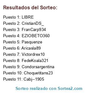Lista de participantes: Juanma_4488, LIBRE., Gonnzaa1903, Nikoparra6, Traidor14, FaberGrisales31, MaauCarp92, Martin_Pradal, FERNANDO_CBA, EmiiThoo_LGI, JonyLaz22.