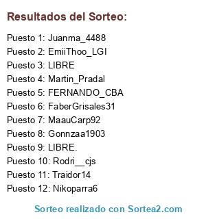 Lista de participantes: Rodri__cjs, Juanma_4488, Gonnzaa1903, Nikoparra6, Traidor14, FaberGrisales31, MaauCarp92, Martin_Pradal, FERNANDO_CBA, EmiiThoo_LGI, LIBRE, LIBRE..