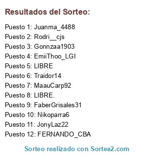 Lista de participantes: Andresp_66, FranCarp934, CristianDS_, Aricasla89, RodriCuervo10, Victordrex10, FedeKoala321, Choquetitans23, Cabj--1905, LIBRE, Pasquenze, LIBRE..