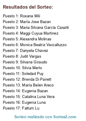 Lista de participantes: Maria Silvana García Casatti, Faltum Lu, Monica Beatriz Vaccalluzzo, Alexandra Molinas, Maggi Cuyua Martinez, María Jose Bazan, Brenda Di Pairett, Silvana Giraudo, Catalina Luna Vera, Eugenia Bazan, Judit Vargas, Danyela Chavez, Eugenia Luna, María Belen Areco, Roxana Mili, Silvia Merlo, Soledad Puy.