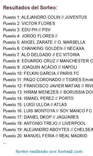 Lista de participantes: MANUEL FERIA // REAL MADRID, ANGEL ZARATE // O. MARSELLA, JUAN MONCADA // BARCELONA, CARLOS GARCIA // MANCHESTER UNITED, EDUARDO CRUZ // MANCHESTER CITY, ALEJANDRO ABOYTES // CHELSEA, MANUEL INOCENCIO // WE UNITED, PAQO CORONADO // TIGRES Emoticón frown, DANIEL DKOP // JAGUARES, EDGAR ORNELAS // REAL BETIS, FRANCISCO JAVIER MATIAS // RIVER PLATE, FELKIN GARCIA // PARIS FC, OSMEL REYES // BOCA JUNIORS, DANIEL RUIZ // KASHIWA REYSOL, GABRIEL LUCAS // LEVERKUSEN, DANN ALARCON //ROMA, LUIS MONTOYA // SOY MANCO FC, ADRIAN SANTILLAN, ANTONIO TREJO // LIVERPOOL, ABRAHAM REA // OGC NICE, HIRAM MENEZES // BORUSSIA DORTMUND, ALEJANDRO COLIN // JUVENTUS, JOAQUIN ACACIO // NAPOLI, LUIGI ULLOA // ATLAS, ALO DELGADO // EC VITORIA, VICTOR FLORES, EDU PH // PSV, ISMAEL PEREZ // PORTO, FRANCISCO ALVARADO // PUMAS, CHANKING GOLDEN // NECAXA, ADRIAN GUERRERO // LEONES NEGROS, JORDO FLORES //.