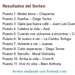 Lista de participantes: Color esperanza – Diego Torres, Cuando nos volvamos a encontrar – Carlos Vives, Te vuelvo a ver – La Combo Tortuga, Volverte a ver – Juanes, Celebra la vida – Axel, Madre tierra – Chayanne, Sencillo - Moral Distraída, Arriba la vida – Croni-K, Sueños – Diego Torres, Vivir mi vida – Marc Anthony, Ojala que llueva café – Juan Luis Guerra.