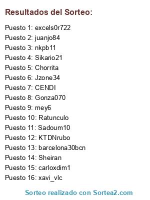 Lista de participantes: Sheiran, Sikario21, KTDNrubo, barcelona30bcn, Chorrita, excels0r722, Ratunculo, CENDI, carloxdim1, Gonza070, nkpb11, Sadoum10, juanjo84, mey6, xavi_vlc, Jzone34.