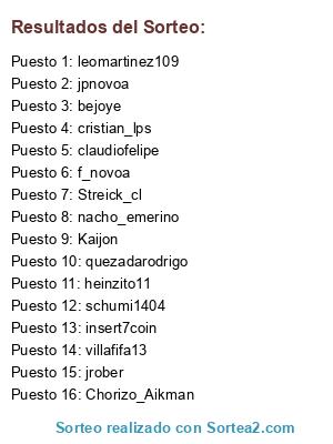 Lista de participantes: villafifa13, claudiofelipe, leomartinez109, Chorizo_Aikman, quezadarodrigo, Kaijon, schumi1404, bejoye, jpnovoa, nacho_emerino, f_novoa, jrober, heinzito11, Streick_cl, insert7coin, cristian_lps.