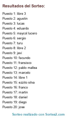 Lista de participantes: pablo mallea, ezzito silva, maycol lucero, fransisco, lucas, eduardo, sergio, daniel, facundo, agustin, turu, marcelo, diego, franco, martin, jose, javi, libre 1, libre 2, libre 3.