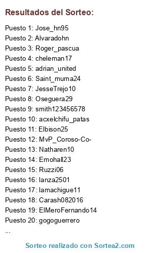 Lista de participantes: acxelchifu_patas, J_Masca17, hatakeczarito, balin2525, lanza2501, jasonop7, Carash082016, Dfwerrwer12, cheleman17, Jonathan-hond, csalinashn, Elmandeayer, Oseguera29, Luizava, brayan_10real, Miguelbass1, elmiso7, Ruzzi06, zurdo614, pollogool-, gejacodi97, KingAdrian956, fadar9709, Mutu504, Daroxhn, Ponty2012, gogoguerrero, medar_r16, adrian_united, Jose_hn95, malv2092, FofoGR8, JesseTrejo10, Natharen10, Elbison25, Prodigioc, Emohall23, davidlpz10_hn, Alvaradohn, smith123456578, jossep7, msosaf0406, Saint_muma24, FIWC_MikeyG, karbert84, lamachigue11, Muma10_elflak0o, ixx-josee504-xxi, mauriciovargas7, kardia_9213, Deasis, RafaelV2525, EdRey9090, fda_14, Roger_pascua, leo_pineda, Vaurquia09, MvP_Coroso-Co-, Soto04-27-1993, ElMeroFernando14.