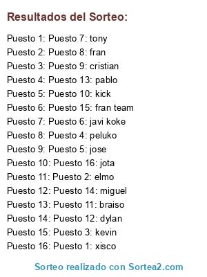 Lista de participantes: Puesto 1: xisco, Puesto 2: elmo, Puesto 3: kevin, Puesto 4: peluko, Puesto 5: jose, Puesto 6: javi koke, Puesto 7: tony, Puesto 8: fran, Puesto 9: cristian, Puesto 10: kick, Puesto 11: braiso, Puesto 12: dylan, Puesto 13: pablo, Puesto 14: miguel, Puesto 15: fran team, Puesto 16: jota.