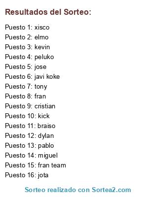 Lista de participantes: tony, fran team, kick, pablo, jose, xisco, braiso, elmo, peluko, fran, dylan, cristian, jota, miguel, kevin, javi koke.