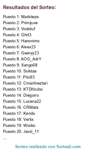 Lista de participantes: Javiii_11, Totis, Geeryy23, Cmartineztari, Kendo, Jzone34, urreaa15, KTDNrubo, Sokitas, Alsala, AOG_AdrY, CRMata, Primijuve, Elantonimone, Lucena22, Hanonimo, Pitu93, Ghrt3, Markiteps, Xango08, Aleex23, Vodotuf, Vertix, Lanun10, MILINKO_PANTIC, Libre, Morcilla, Wisiko, Diegorro, Oscarbale11, Chorrita HUELE A POLLA, Elsergio28.