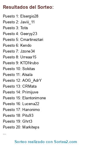 Lista de participantes: Elsergio28, Javii_11, Totis, Geeryy23, Cmartinezari, Kendo, Jzone34, Urreaa15, KTDNrubo, Sokitas, Alsala, AOG_AdrY, CRMata, Primijuve, Elantonimone, Lucena22, Hanonimo, Pitu93, Ghrt3, Markiteps, Xango09, Aleex23, Vodotuf, Vertix, Lanun10, Milinko_Pantic, Libre, Morci, Wisiko, Diegorro, OscarBale11, Chorrita.