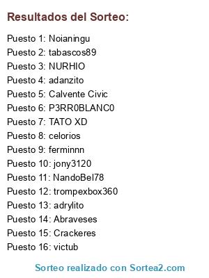 Lista de participantes: Calvente Civic, Crackeres, NandoBel78, TATO XD, P3RR0BLANC0, victub, adrylito, jony3120, Noianingu, ferminnn, Abraveses, NURHIO, trompexbox360, adanzito, tabascos89, celorios.