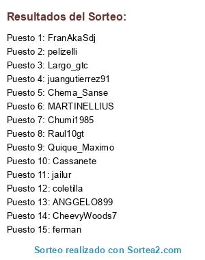 Lista de participantes: MARTINELLIUS, CheevyWoods7, ANGGELO899, pelizelli, jailur, FranAkaSdj, ferman, coletilla, Chumi1985, Raul10gt, Chema_Sanse, Largo_gtc, Quique_Maximo, juangutierrez91, Cassanete.
