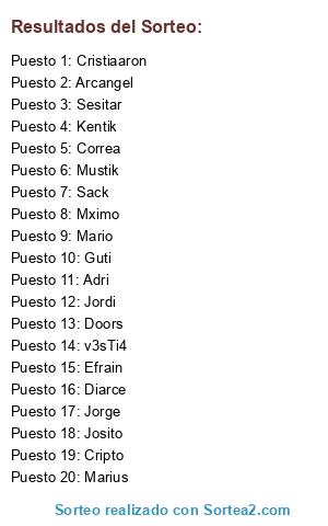 Lista de participantes: Kentik, Adri, Mustik, Guti, Diarce, Mximo, Jorge, Jordi, Correa, Cripto, v3sTi4, Mario, Sack, Arcangel, Sesitar, Doors, Josito, Cristiaaron, Efrain, Marius.