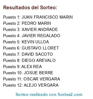 Lista de participantes: XAVIER ANDRADE, DIEGO AREVALO, JUAN FRANCISCO MARIN, PEDRO MARIN, ALEJO VERGARA, JAVIER REGALADO, KEVIN ULLOA, ALEX REA, JOSUE BERRE, OSCAR VERGARA, DAVID SACOTO, GUSTAVO LLORET.