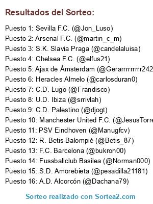 Lista de participantes: Fussballclub Basilea (@Norman000), S.D. Amorebieta (@pesadilla21181), Heracles Almelo (@carlosduran0), PSV Eindhoven (@Manugfcv), C.D. Lugo (@Frandisco), C.D. Palestino (@djogt), S.K. Slavia Praga (@candelaluisa), Chelsea F.C. (@elfus21), U.D. Ibiza (@srrivlah), Sevilla F.C. (@Jon_Luso), F.C. Barcelona (@bukron00), Ajax de Ámsterdam (@Gerarrrrrrrrr242), R. Betis Balompié (@Betis_87), Arsenal F.C. (@martin_c_m), A.D. Alcorcón (@Dachana79), Manchester United F.C. (@JesusTorress).