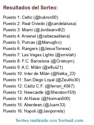 Lista de participantes: Al-Nassr (@Norman000), San Diego Loyal (@Zeulito30), Las Vegas Lights (@srrivlah), Celtic (@bukron00), Miami (@Jordisanvi82), Real Oviedo (@candelaluisa), Rangers (@JesusTorress), Arsenal (@cabezaablana), F.C. Barcelona (@Cristoym), Pumas (@Manugfcv), A.C. Milán (@elfus21), Inter de Milán (@Nelka_23), Aberdeen (@Juanr33), Cádiz C.F. (@ferrari_4567), Napoli (@Javiporrets), Newcastle (@Sheraton159).