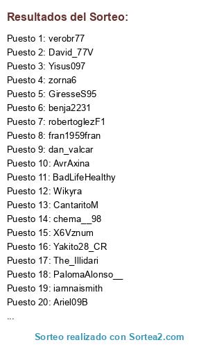 Lista de participantes: Enri86_, VictorM23844691, SergioDazBlanc1, Vero78G, boyibs1, sergio_anthonyp, josemari_l2r2, MariquillaDel86, Moigarciia21, michelelmejor, BabyYod28812729, Andrea_MeLlamo, AdryVanPetersen, Antonio_G_N_, Miika_02, quinpau, rafaelchecafos, iamnaismith, crispi08, MKTvideospots, juanfremd, 1CarmenSanchez1, raumat2, jacaballero21, Gorbet_, SoyElege_, GoriiATH, BelenMilagrosA1, daviiiiiiii8, ferran_marin, JosManuelPla1, fc_girona, FinaLoCe, sharubitha, verobr77, NandoCorbalan, ZohanAMC_YT, olliiveraa, KaBuxYT, spscrazy, zorna6, Wikyra, topmary01, sabato01, Rufi00, anun01, carferg1, vadames_74287, jlopez_m, Pirri_25, Nenademalaga, Miguelcomares, carretero_sonia, kamox15, marybruxa, mggpetepau, JoseJuan21, aDrYv_v, valleadri97, danippperez, guiver1998, QUIQUEF2, VBeSweet, loviacc, SamuAlvarez7, Adriakin1, AlexEsteban2201, chemael8, EmilianoEjcr82a, Mr_TrebleClef, Just_Josue27, edgarsagre, xsotanx, raafacu, Juanfrael7, strixgoi, guerreracream, CarlosColt1, Hermanexfixer, MiniGrasshopp, AlbaMartinez04, superluis, Verguen07992702, manuelps04, B4doiuVictor, ReapzKotto, pickspronos, daveknappe, 0skarr86, Kiki93329965, Angyficacion, SrBenaveent, ruulo_bz, AngyRdez, fran1959fran, frn_jf, fernan253, Fernandoper12, 341995p, vicen_viv, catalinacc55, RoberoJL, GelitaAngelota, Panchova4, Cristobal2346, burgosgce, ChikyHigh, Josebavm15, PicksRastreator, unaigarcia_, bobbaangel99, PxbloSsj, Isabelita_yes, LadyBlinders, Villa_Mara92, jose_negrillo, sjdbxjs, Alexdemanuel, Reall_Ender, DiviRL, johan_mas, salvalopcar, andress_sal, weede_com_es, Al_Sants, Excel_TIRPAC, Pesale93, Cesaryusgar_7, thelostiseazy, rintin666, mariaruben8180, M3rCy_StrikE, kikeluque12, RagingEagle_, deggialz, EdgarHe37324968, Artefackt0, Yisus097, JoMiMaXa, fejaim, JorgeeeBS, Ritsureiss, kkiiker, Nogalesr_, JLertxundi, revelacion_1, MarioRu3, Pabbl097, ScaiLanCrei, JSegura91, SirLaw__, rubenalaminos, ESLspain, Aisgar1, jesus_quintans, ivan1101rm, AmorBeltra, Omar_Tarqui, claudosky, puxasimracing, trollmiguelcrr, Javi_BG96, Fede_la_vila, Benzaka99, MoneyHeistFan, Brian24bcntwits, MayLuni16, Angel25mas, Elias30555714, Jaume12054757, 2ataca2, sdanieel_, gokuporreta, Fcb09_10, Thundervolt_BS, RaykazCS, amomiado, Soengas73, zzLuckii_, ikersol1, Alfi7u7, FerranF_BS, zarcero86, rmur_pablo, Neko_COC26, 202Nordzz, gessler_E, cipotti, Rodrigo51454693, ShadowKillers_, Fedex54_, Seikk_tw, Roberrex827, Elite_Hispania, DanielRMCF28, claunthem, dan9089, bloonsbury, owls_vg11, Yakito28_CR, gullon94, ByronGT36, gargon26, Groun_CoC, CcSaro, KaltNas, brendzhor, LU1SPA, AKAYuste, MacboraFuriano, GuillZa, krespo046, MadOscar17, eSportsMAPFRE, sergiolo10, p_a_b_l_o18, Robertexpo, CocJosevp, iwain16, ZeroDax_71, AlvaroG60492879, AkramCoC, DeporPobra, ClarensIvan, Dy3g01, 1BlackEagles, MBoketes, alphazyron, robertoglezF1, Che27910271, raulkiroga, Chechurl, Arbos10, Alboma92, Sh4nks_HS, jmbohoyo, Javimesas, XanderStag, Kaessar7, marc_gp10, PipGirl111, RPolloloco, Waxer59, IKeL51604385, Waja122, X6Vznum, CMFoficial, ESPLoboElite, v_soto_p, jigllop, Selectiv0, R3Sther, laab_bs, AlbertoEsko, oscarpf97, crazy_bots, AlosBS, FrostiesHd, LpzadeCSGO, Yusef210, perejil181, AitoHernandez, RafinhaCsgo, byraulo, ElJuanitoNieve, Jhon_FuckYeah, SergioDelgadus, alltalay, Marcoser15, mvstercs, dOSCARas760, jurebiisco, alexsenillosa, alejandro_Vk, nomemareees, Eco_gg_es, xav1ers, alejandroaamore, Nasio_06, JotitaTv, 0_ditello, JanGFX_KT, Jairettecs, the_mura_, POM3L0, Damizippi_FTW, iPlumusCSGO, aaronespat3, ccarlos1804, olmeda2110, its_6MMB, DNacheete, Angel_UJm_, Kuko_GTI, Eka1n, franmunoz_05, jlanzop, Ppedro273, Marisol_madav, Josit0o199, victorlopcab, victor08sg, KoreanZ_, diogomarques44, dan_valcar, asobu_esports, Antonio_cl53, Mr_Cortese, oscarserranosp, mislok84, victorlopezcab7, sharmonder, antmuva, Miguewn, by_GPK, PactoMortal1, kidjowy, Broly_xd, iAndreaMR, Jakesaurius, Seniki_, AdriM002, don_Patch14, pfgubeda, SouoCorreia, danil0aim, msanthony2, OmarSan10, GonzaloCaba, _JaviTaba_, Rulo25CR, Legusla, 7Javidlc.