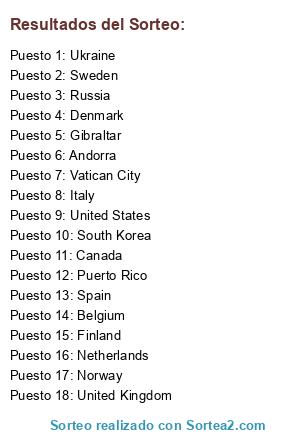 Lista de participantes: United States, Puerto Rico, United Kingdom, Italy, Belgium, Gibraltar, South Korea, Sweden, Denmark, Vatican City, Ukraine, Spain, Russia, Finland, Norway, Andorra, Canada, Netherlands, .