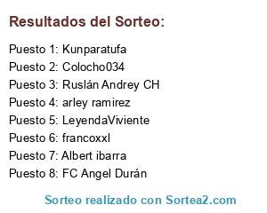 Lista de participantes: Kunparatufa, FC Angel Durán, Ruslán Andrey CH, Colocho034, francoxxl, Albert ibarra, arley ramirez, LeyendaViviente.