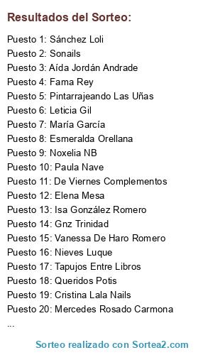 Lista de participantes: Paula Nave (2 participaciones), Fama Rey (2 participaciones), Elena Mesa (2 participaciones), Paqui Risquez (2 participaciones), Esmeralda Orellana (2 participaciones), Roser Valo, Leticia Gil, Laura Dominguez Santillana, Vanessa De Haro Romero, Aída Jordán Andrade, Avon La Laguna, Nieves Luque, Pintarrajeando Las Uñas, María García, Tapujos Entre Libros, Isa González Romero, Gnz Trinidad, Ana Vazquez, Sánchez Loli, Mercedes Rosado Carmona, Noxelia NB, Cristina Lala Nails, Queridos Potis, De Viernes Complementos, Mallirubi, Sonails.